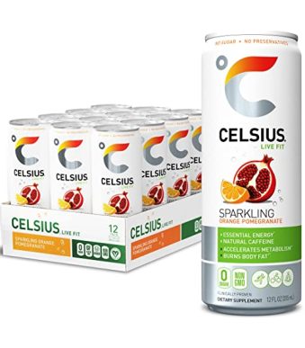 CELSIUS Sweetened with Stevia Sparkling Fitness Drink, Zero Sugar, Slim Can, Orange Pomegranate, 144 Fl Oz (Pack of 12)